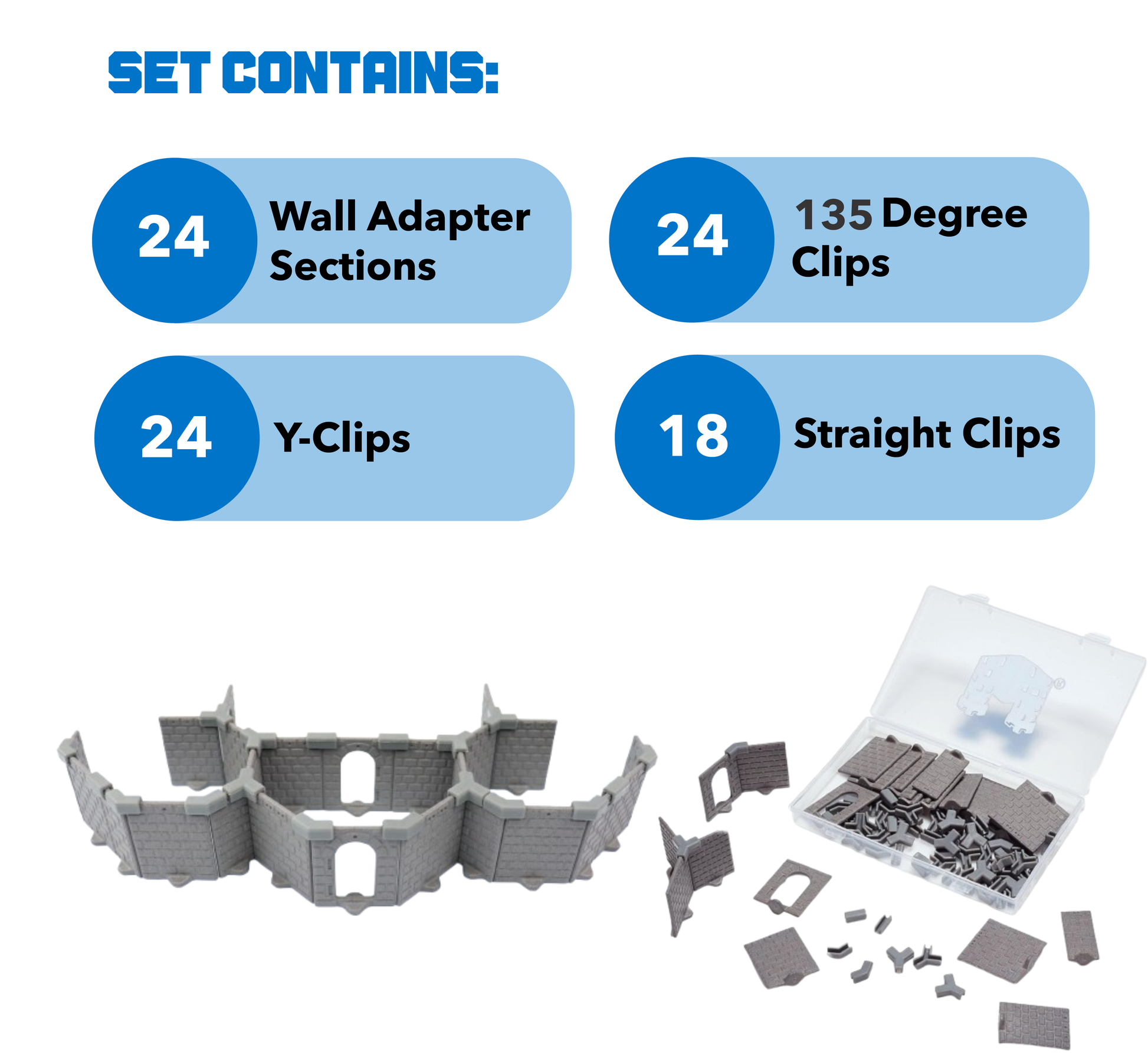 24 large pieces that allow the standard wall segments of the Dungeon and Castle Sets to cross 1” grids accurately along 45° angles. Adds huge variety and options to the boxy rooms of the Dungeon Sets, or to the oblong rooms of the Castle Sets.